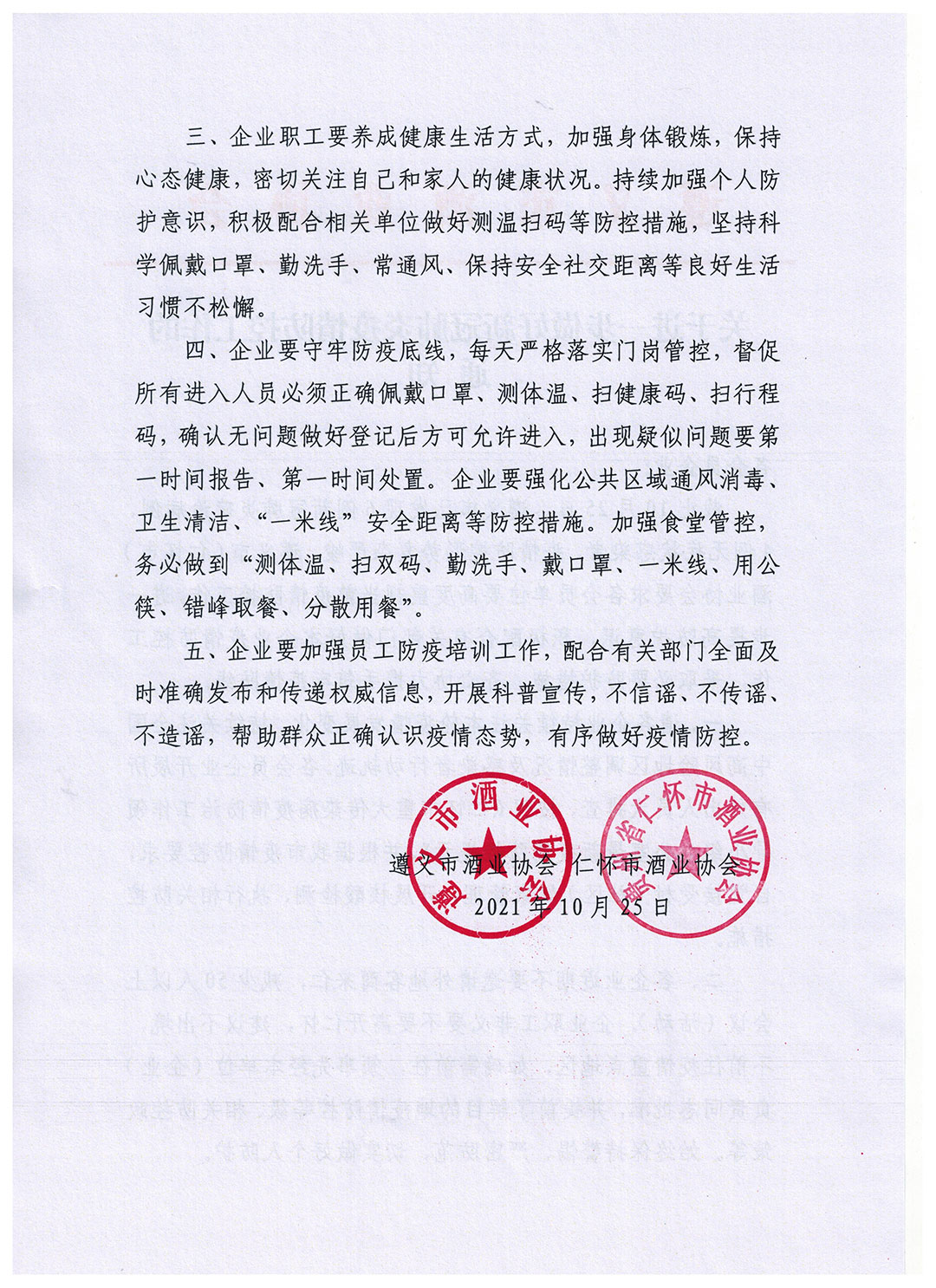 截止10月25日,遵义市已发现6例新冠肺炎确诊病例,4例无症状感染者,疫情防控形势复杂严峻。遵义市(仁怀市)酒业协会要求各会员单位要高度重视当前疫情防控工作,进一步提高防护意识,积极配合有关部门做好本企业疫情防控工作,采取必要防护措施,齐心协力携手筑牢疫情防线。