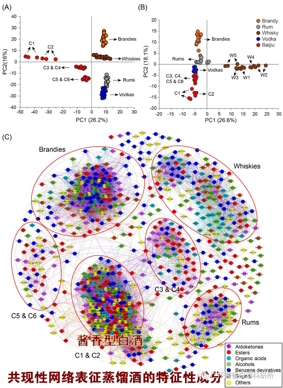 江南大学徐岩教授团队历经3年多克难攻坚,顺利完成了合作研究内容,取得了阶段性的研究成果。研究团队通过开发基于代谢组学的蒸馏酒全谱成分分析的方法,首次完成对来自仁怀产区具有代表性的酱香型白酒成分进行全面分析,鉴定出挥发性物质114种,检测出不挥发性物质109个,其中发现独有香气成分共96种,其潜在活性成分相对较多。研究团队从已经定性出的物质中发现了一些具有潜在生物活性的物质,例如短链脂肪酸,短链脂肪酸可以起到抗炎作用,还能从源头上防止肠漏的发生。