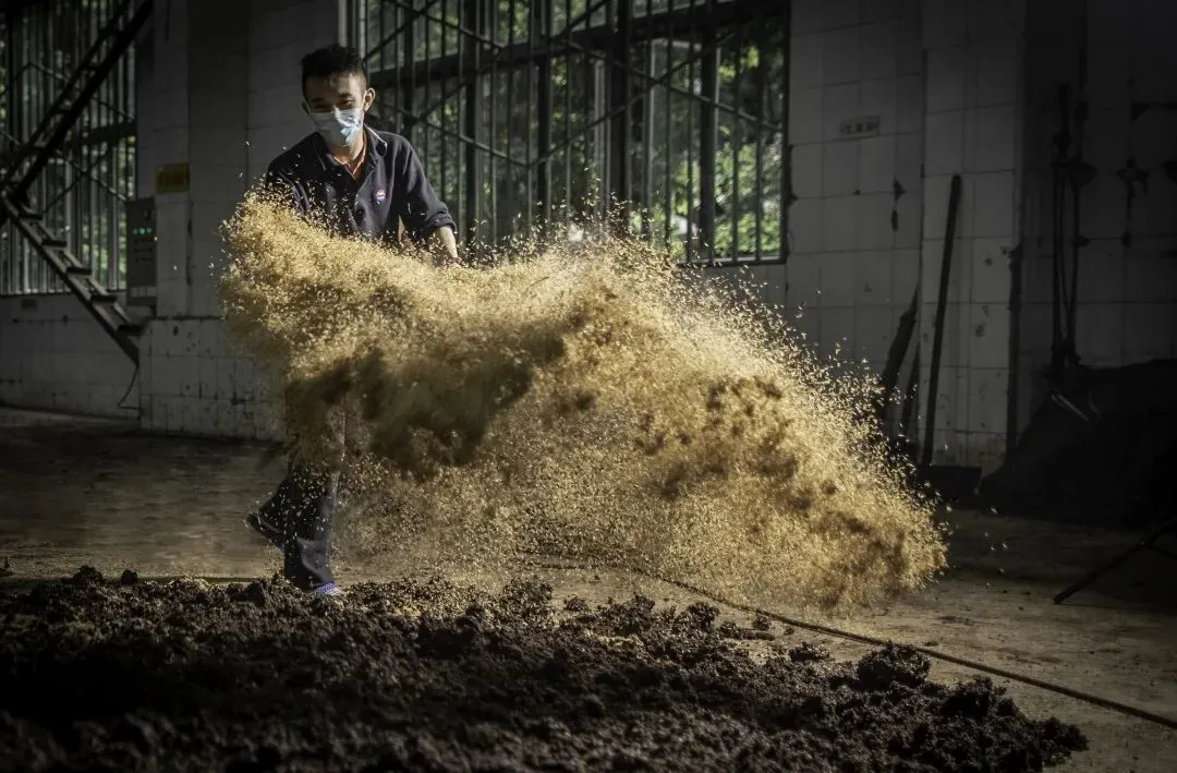 待糟醅晾到适宜的温度,随后,堆积发酵便开始了。这也是目前在全国白酒工艺中,以茅台酒为代表的酱香型白酒所独有的工艺。
