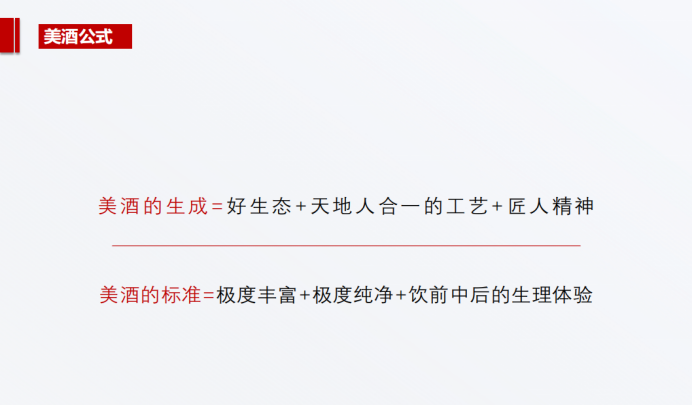 同时,对产品的价值挖掘,也需要站在消费者的角度讲消费者能够听得懂的话,找准利益点和支撑点。需要进行多次的翻译,才能把总共的话语体系翻译成消费者在不同场景下听得懂的话术。云潇雨表示:君度将美酒公式总结概括为两个方面:即美酒的生成=好生态+天地人合一的工艺+匠人精神,而美酒的标准=极度丰富+极度纯净+饮前中后的生理体验。
