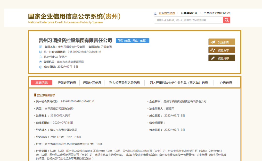 7月18日,记者从国家企业信用信息公示系统获悉,贵州习酒投资控股集团有限责任公司(以下简称:习酒集团)已于7月15日成立组建。